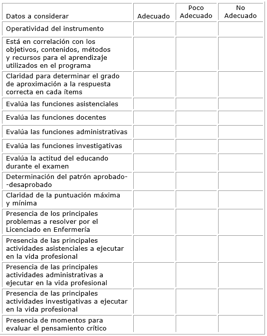 El examen práctico en las carreras que pertenecen a las Ciencias Médicas es un componente necesario cuando se pretende evaluar la competencia profesional de un educando. Esta evaluación en la Licenciatura en enfermería debe garantizar la posibilidad de verificar los valores profesionales, el rol del licenciado en enfermería, las habilidades básicas del directivo y de trabajo en equipo, así como destrezas en la comunicación, en los procedimientos de enfermería, en el proceso de atención de enfermería en función de generar intervenciones para promocionar un cuidado óptimo, además debe comprobar habilidades docentes.8-10