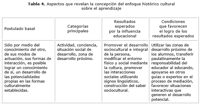 De modo general cuatro aspectos revelan la concepción del enfoque histórico-cultural sobre el aprendizaje (tabla 4).12