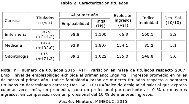 Como consecuencia natural del aumento de la matrícula y los adecuados niveles de eficiencia educativa se observa un aumento significativo en el contingente de nuevos titulados. Stock profesional que, unido al formado en otras latitudes que compite en un mismo ámbito laboral, tensiona el mercado del trabajo. Aunque se observan adecuados niveles de empleabilidad, Odontología registra dificultades para emplearse al primer año, a la vez que exhibe los menores niveles de ingreso promedio.