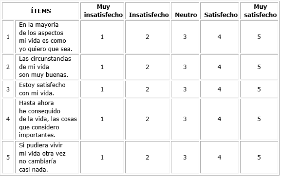 Por otro lado, la satisfacción con la vida, definida con el modelo de Diener como el juicio o la evaluación cognitiva de la propia vida, se midió a través de la escala de satisfacción con la vida (SWLS, Anexo 2).(2) Entonces, con el fin de que los estudiantes pudieran contestar la prueba de manera más sencilla y rápida, las opciones de respuesta de la escala original se redujeron de 7 a 5. Tomando como referencia las categorías de la prueba original, se realizó la siguiente equivalencia: el puntaje mínimo fue de 5 y el máximo de 25. Los criterios de corrección se presentan a continuación: