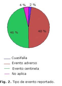 Fueron reportados 4 (2 %) cuasifallas, 96 (48,5 %) eventos adversos, 91 (46 %) eventos centinela y 7 (3,54 %) no fueron eventos adversos sino actos administrativos (Fig. 2).