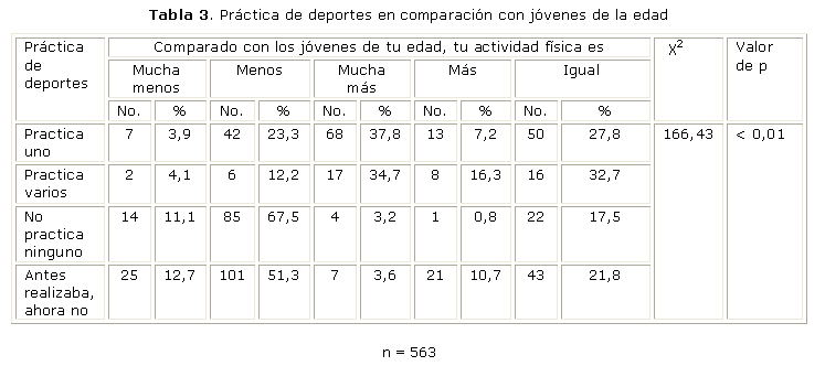 Los estudiantes que no practicaban ninguna actividad física percibieron que realizaban menor cantidad de actividad física que los jóvenes de su edad; contrario a los que sí hacían, en su mayoría refieren realizar más o igual actividad (c2 = 166,43, gl = 12, p < 0,01), como lo muestra la tabla 3.