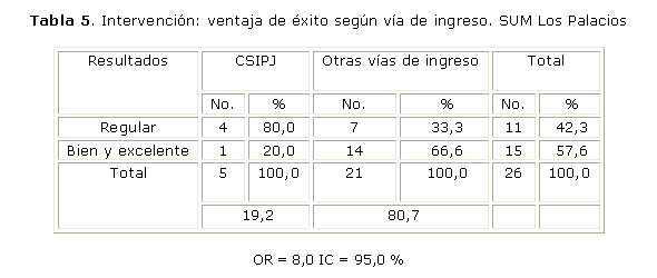 Después de la intervención, no existieron estudiantes evaluados de mal y/o no evaluados, pero los peores resultados estuvieron en el CSIPJ con el 80,0 % evaluado de regular y 8 veces más propensos a obtener notas regulares (tabla 5).