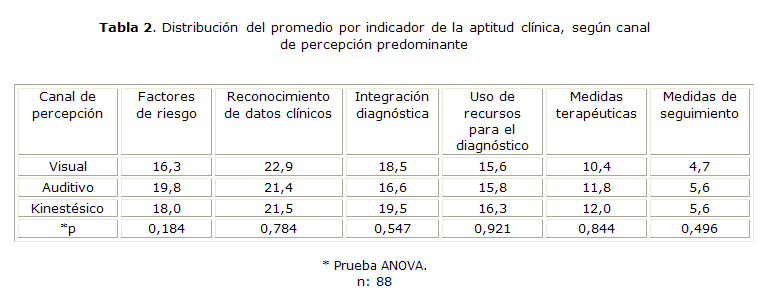 Para realizar la comparación de la aptitud clínica, según el canal de percepción predominante de los grupos estudiados se utilizó la prueba de ANOVA de un factor. La consistencia interna del instrumento se estimó mediante el coeficiente Alfa de Cronbach.