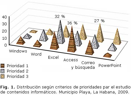 - Criterio de los médicos sobre la prioridad de los contenidos de informática que necesitan para su desempeño: se enumeraron los contenidos de forma consecutiva según criterios de prioridad, este indicador se midió en escala ordinal.