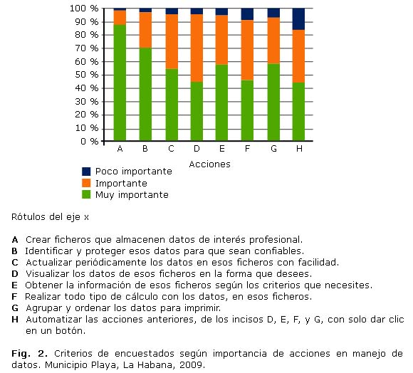 La figura 2 muestra los resultados obtenidos respecto a la importancia que, para el desempeño de su trabajo los médicos encuestados consideran, relativas a utilizar la computadora para realizar diferentes acciones que permiten el manejo de datos, independientemente de tener una preparación previa en este contenido, más del 50 % considera que son muy importantes la mayoría de las acciones y las restantes importantes, coincidiendo de forma mayoritaria en que es un requerimiento para su mejor desempeño en la actividad cotidiana, lo que confirma la identificación del conocimiento de las bases de datos como una necesidad de aprendizaje.