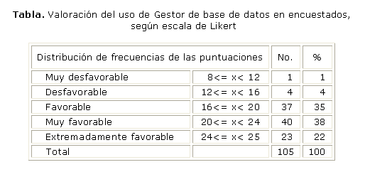 - Valoración hacia el uso de un Sistema Gestión de Base de Datos:14 se utilizaron los 8 ítems anteriores con vistas a medir la predisposición de los médicos para responder de manera favorable o desfavorable respecto a la utilización de un gestor, otorgándosele una escala de valores de 1 a 3 puntos, donde 1 se corresponde con las acciones que los encuestados consideraron de menor valoración (poco importantes) y 3 con la mayor (muy importantes). Por tanto los valores de las puntuaciones oscilaron entre 8 (si se consideran las 8 acciones como poco importantes) y 24 (si se consideran las 8 acciones muy importantes).