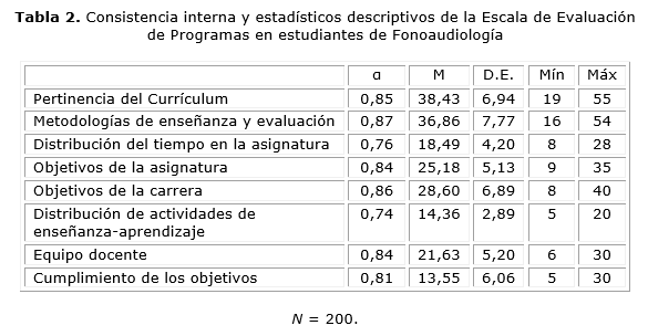 En la tabla 2, se observa además, que la media para la pertinencia del currículum fue de 38,43 (D.E. = 6,94) con un nivel de confiabilidad de 0,85; la media para el factor Metodologías de enseñanza y evaluación fue de 36,86 (D.E. = 7,77) con un α de 0,87; la media para la Distribución del Tiempo fue de 18,49 (D.E. = 4,20) con un nivel de confiabilidad de 0,76; el factor objetivos de las asignaturas tuvo una media de 25,18 (D.E. = 5,13) con un nivel de confiabilidad de 0,84; los objetivos de la carrera tuvo una media de 28,60 (D.E. = 6,89) con un nivel de confiabilidad de 0,86; la distribución de actividades de enseñanza - aprendizaje presentó una media de 14,36 (D.E. = 2,89) con un nivel de confiabilidad de 0,74; el equipo docente tuvo una media de 21,63 (D.E. = 5,20) con un nivel de confiabilidad de 0,84 y por último, el factor cumplimiento de los objetivos presentó una media de 13,55 (D.E. = 6,06) con un nivel de confiabilidad de 0,81.