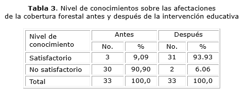 La tabla 3 representa el nivel de conocimientos de las estudiantes antes y después de la intervención educativa acerca de las afectaciones a la cobertura forestal, se observa que antes de la intervención era no satisfactorio en un 90,90 % y satisfactorio solo en un 9,09 %. En un segundo momento después de la intervención ya los resultados satisfactorios alcanzados fueron de 93,93 %.