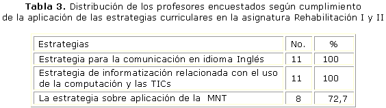 The comprehensive formation of the students is the key objective of the educational-teaching process in the higher education. This presupposes to understand that the formation is not effective if it just takes care of assuring that the students will acquire certain pieces of knowledge and skills. The present paper was aimed at evaluating the implementation of and compliance with the curricular strategies in Rehabilitation I and II of the odontology studies. To this end, a descriptive and cross-sectional study was performed in 2011 on the basis of interviews to 11 professors from the denture department and to 80 third-year students from the Dental School of La Habana province. According to the results, the students admitted that the strategy for skill development in the handling of information and computing was the most used in the course of subjects. Over two thirds of the professors recognized that the level of evaluation of strategies was focused on specific topics of the subject, although all the professors stated that the strategies were implemented as a whole throughout the subject. It was concluded that the professors of the denture department do implement all the curricular strategies that are defined for this subject in the odontology career, but they are not fully capable of defining them in detail.