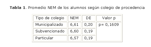 El promedio de notas de enseñanza media para la totalidad de la muestra correspondió a un 6,59, con una desviación estándar de + 0,20. Al comparar el promedio NEM de los estudiantes de las distintas dependencias no se apreciaron diferencias significativas (tabla 1).