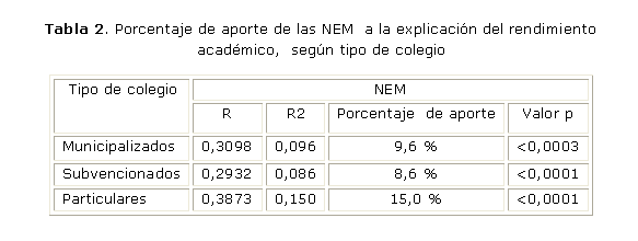 El mayor porcentaje de aporte a la explicación del rendimiento académico, al desagregar las NEM por tipo de dependencia, correspondió a los colegios particulares, muy por encima de las NEM de colegios municipalizados y subvencionados (tabla 2).